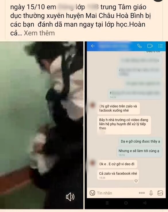 Cụ thể, video lan truyền ghi lại cảnh một học sinh đang theo học tại Trung tâm Giáo dục nghề nghiệp - Giáo dục thường xuyên huyện Mai Châu, tỉnh Hòa Bình bị nhiều học sinh khác dùng tay, chân đấm đá vào mặt và cơ thể ngay trong lớp học.