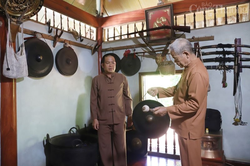 | Ông Bùi Văn Quỷa (phải) xóm Bái Trang, xã Đông Lai, huyện Tân Lạc đang truyền dạy cách gìn giữ và phát huy bản sắc văn hóa chiêng Mường cho con cháu |