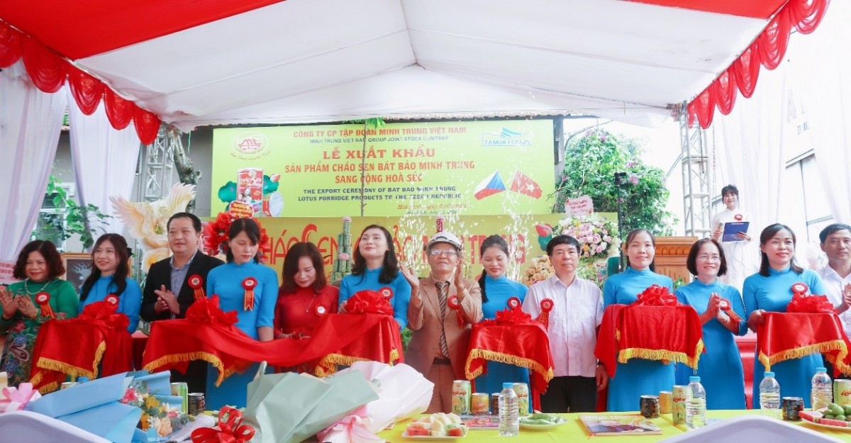 Giám đốc Sở Công Thương Phạm Tiến Dũng (áo trắng ở giữa) cùng các đại biểu dự lễ xuất khẩu sản phẩm Cháo sen bát bảo Minh Chung sang Cộng hòa Séc (Ảnh: SCT) |