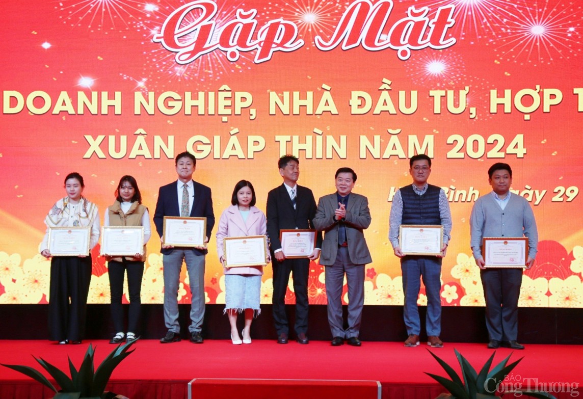 | Nhân dịp này, UBND tỉnh Hòa Bình tặng Cờ thi đua cho 3 doanh nghiệp tiêu biểu xuất sắc, dẫn đầu phong trào thi đua yêu nước năm 2023; tặng bằng khen của Chủ tịch UBND tỉnh Hòa Bình cho 17 doanh nghiệp hoạt động trên địa bàn. |