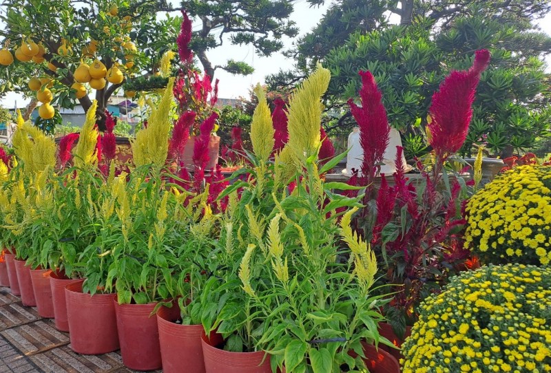 Bên cạnh cúc mâm xôi, mào gà đuôi phụng cũng được nhiều khách hàng ưa chuộng để trưng bày trong dịp Tết vì màu sắc bắt mắt. |
