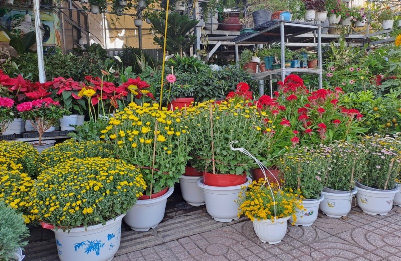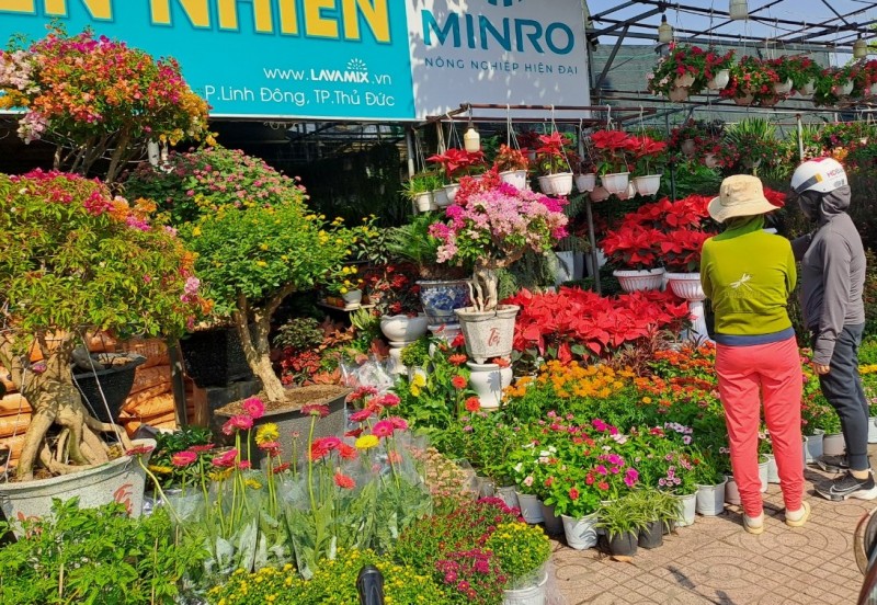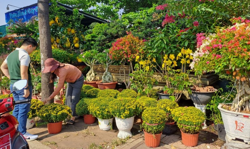 Ghi nhận dọc tuyến đường Phạm Văn Đồng (TP. Thủ Đức, TP. Hồ Chí Minh), có khoảng 30 điểm bán cây cảnh đã trưng rất nhiều hoa cúc mâm xôi, kim ngân lượng, quất, bưởi diễn, hoa mai… để phục vụ khách.
