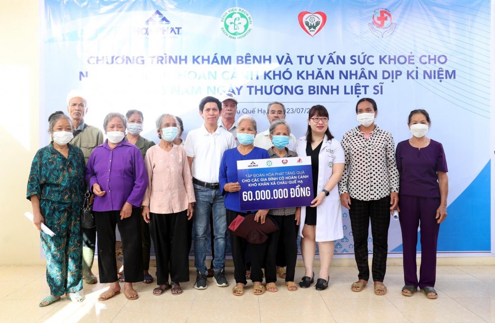 Tập đoàn Hòa Phát vừa tài trợ, phối hợp với Bệnh viện Bạch Mai thực hiện chương trình khám bệnh, tư vấn sức khỏe miễn phí cho gần 300 đồng bào các dân tộc thuộc diện hộ nghèo, gia đình có công tại xã Châu Quế Hạ, huyện Văn Yên, tỉnh Yên Bái. Nhân dịp này, Hòa Phát cũng trao quà cho bệnh nhân, người dân có hoàn cảnh khó khăn, gia đình chính sách và tài trợ trang thiết bị y tế tổng trị giá 160 triệu đồng.