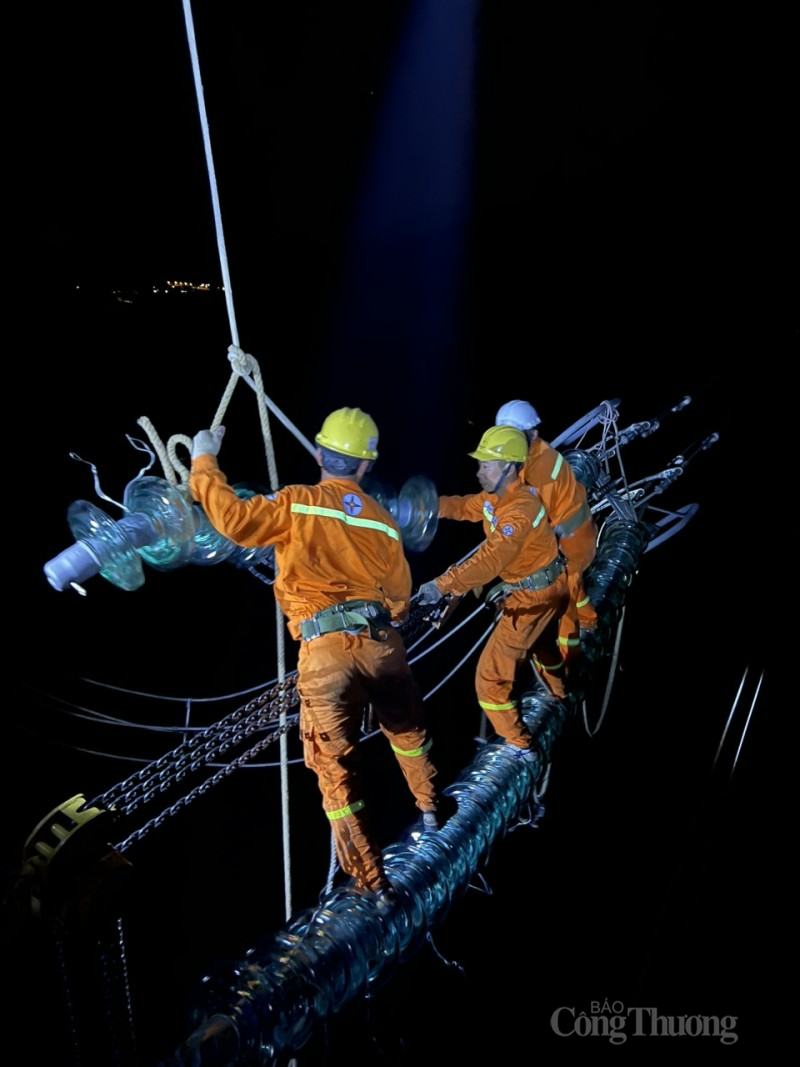 | Những người thợ điện trong đêm tối vẫn tập trung cao độ để tháo dỡ và lắp các chuỗi cách điện |