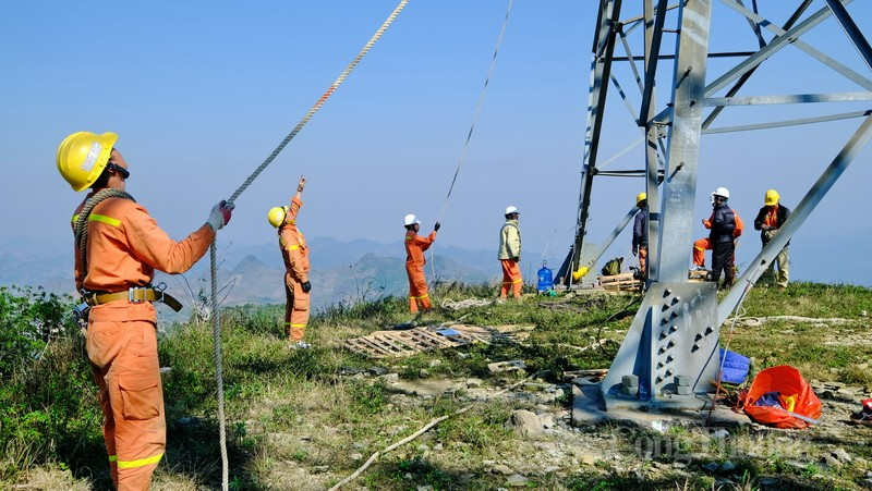 | Những người thợ điện phải treo mình trên độ cao từ 40-50m để thi công |