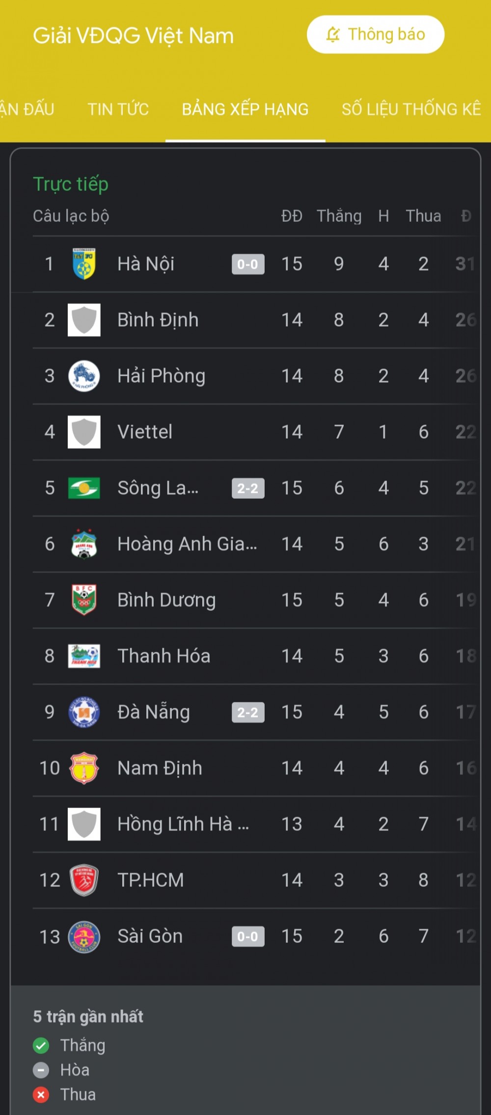 Bảng xếp hạng V-League ngay sau trận Hoàng Anh Gia Lai – Becamex Bình Dương |