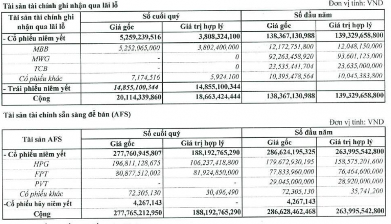 Trong danh mục FVTPL, cổ phiếu niêm yết có giá trị đầu tư lớn nhất là MBB với giá gốc là 5,25 tỷ đồng, cổ phiếu khác là hơn 7 triệu đồng; khoản mục trái phiếu niêm yết ghi nhận gần 15 tỷ đồng. Tại danh mục AFS, cổ phiếu HPG là khoản đầu tư lớn nhất có giá gốc gần 197 tỷ đồng, tiếp đến là cổ phiếu FPT với giá gốc gần 81 tỷ đồng, cổ phiếu khác là hơn 72 triệu đồng…