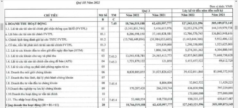 Ngoài doanh thu tự doanh ghi nhận lỗ, doanh thu môi giới chứng khoán quý III của Trí Việt cũng chỉ đạt 8,8 tỷ, giảm hơn 22 tỷ so với cùng kỳ. Lũy kế 9 tháng năm 2022, Chứng khoán Trí Việt ghi nhận 127,4 tỷ đồng doanh thu, lợi nhuận sau thuế đạt 34,2 tỷ đồng, lần lượt giảm 58% và 83% so với cùng kỳ.
