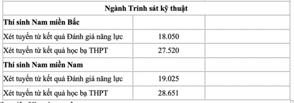 Ở phương thức xét học bạ, Học viện Khoa học quân sự có đầu vào cao nhất. Thí sinh nam ở miền Nam đăng ký vào ngành Trinh sát kỹ thuật cần đạt 28,651 điểm để trúng tuyển. Ngành thấp nhất là Quan hệ quốc tế lấy 27,223 điểm, với thí sinh nam.