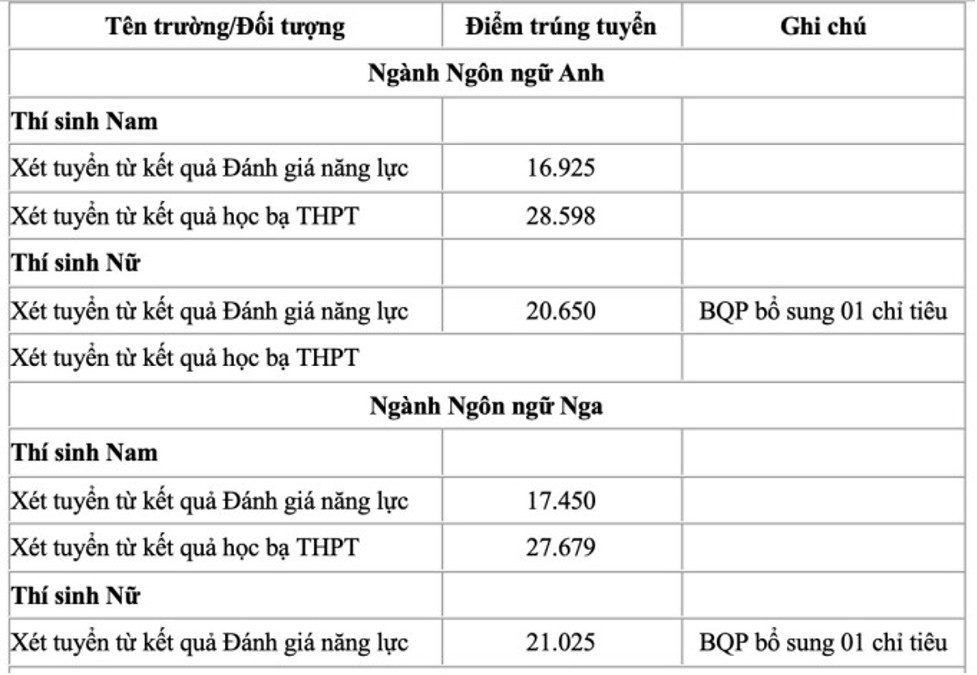 Năm ngoái, điểm chuẩn theo kết quả thi tốt nghiệp vào các trường quân đội từ 16,25 đến 27,97. Học viện Khoa học quân sự lấy cao nhất, thấp nhất là trường Sĩ quan Công binh.