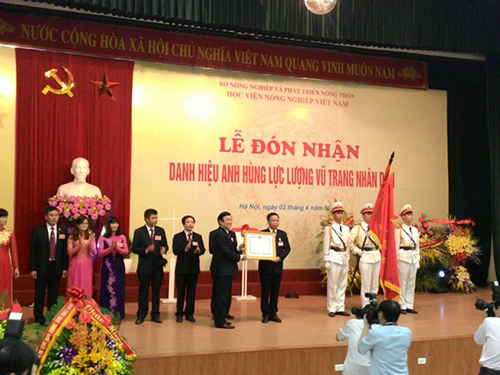 Ngày 3/4/2015, tại Hà Nội, Học viện Nông nghiệp Việt Nam tổ chức trọng thể Lễ đón nhận danh hiệu Anh hùng Lực lượng vũ trang nhân dân. Chủ tịch nước Trương Tấn Sang, đại diện lãnh đạo các Bộ ngành Trung ương cùng đông đảo các thế hệ thầy và trò của Học viện tham dự buổi lễ.