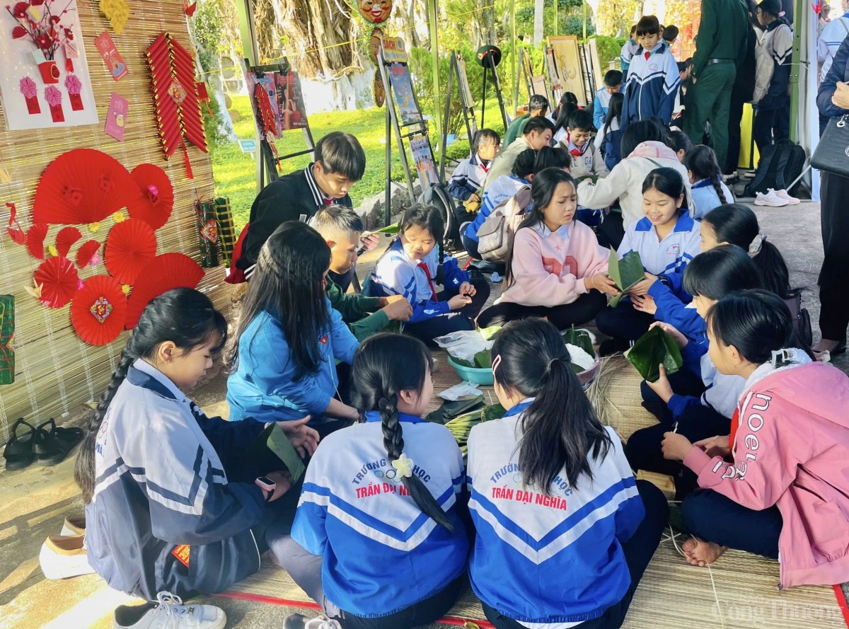 | Hoạt động quy tụ đông đảo các em thanh thiếu nhi tham gia trải nghiệm gói bánh chưng |