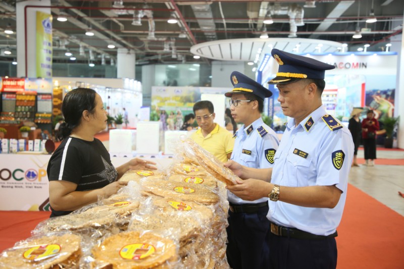 | Lực lượng Quản lý thị trường kiểm soát các mặt hàng được bày bán tại Hội chợ |