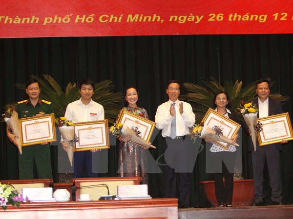 | Đồng chí Võ Văn Thưởng, Ủy viên Bộ Chính trị, Bí thư Trung ương Đảng, Trưởng Ban Tuyên giáo Trung ương trao bằng khen cho các tập thể đạt thành tích trong năm 2017. (Ảnh: Thanh Vũ/TTXVN) |