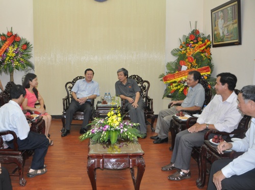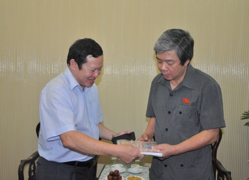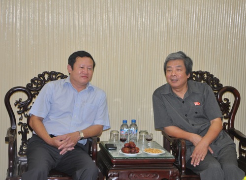 Ông Hà Minh Huệ- Phó Chủ tịch thường trực Hội Nhà báo Việt Nam (bên phải) tiếp Tổng biên tập Báo Công Thương Nguyễn Hữu Quý.