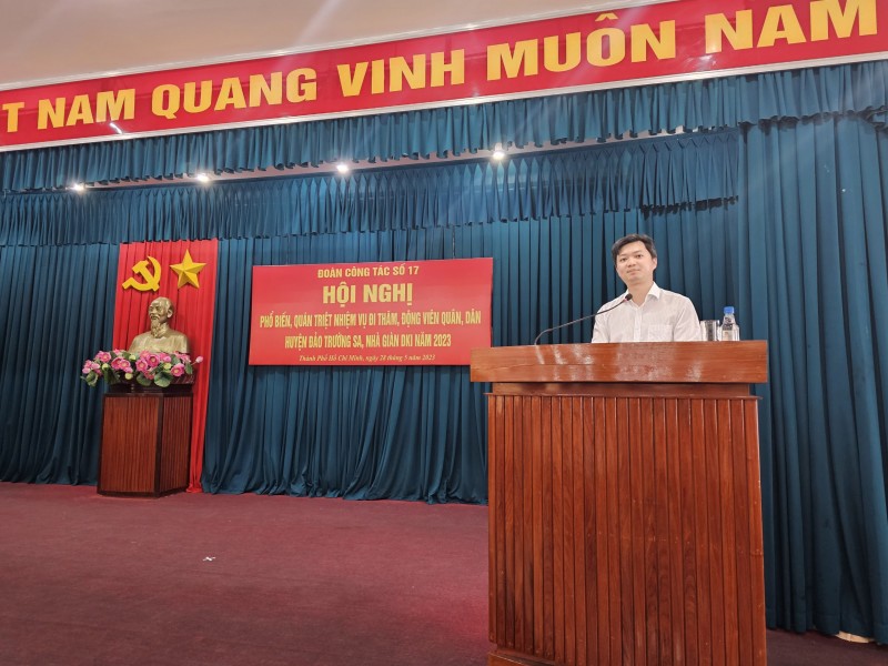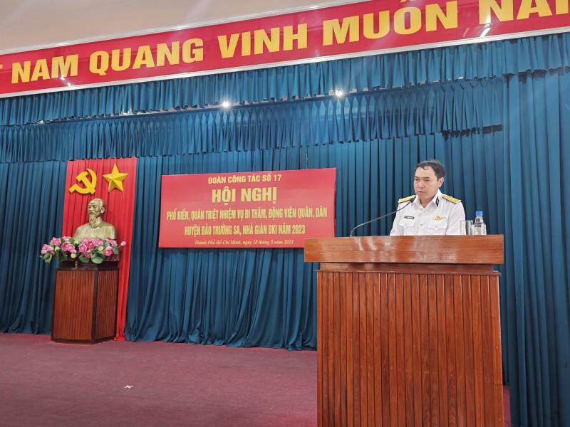 | Đại tá Lê Hồng Quang phát biểu tại hội nghị tập huấn trước giờ Đoàn công tác số 17 đến thăm huyện đảo Trường Sa |
