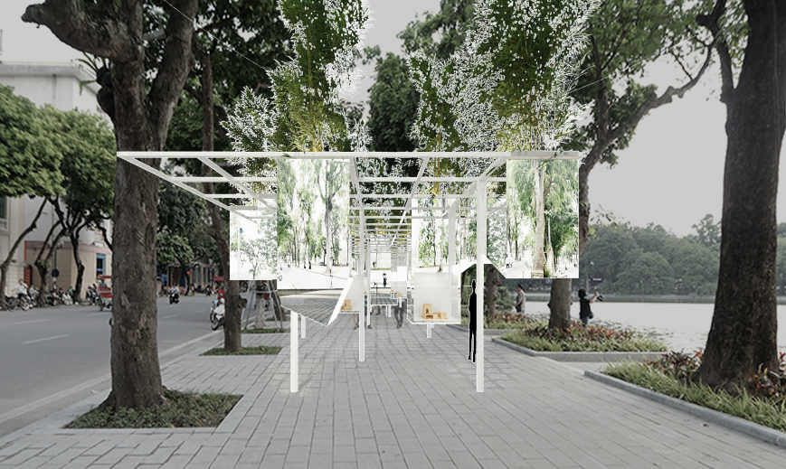 | Không gian triển lãm ALP Pavilion tại phố đi bộ Hồ Hoàn Kiếm. Ảnh thiết kế 3D bởi NGHIA-Architect |