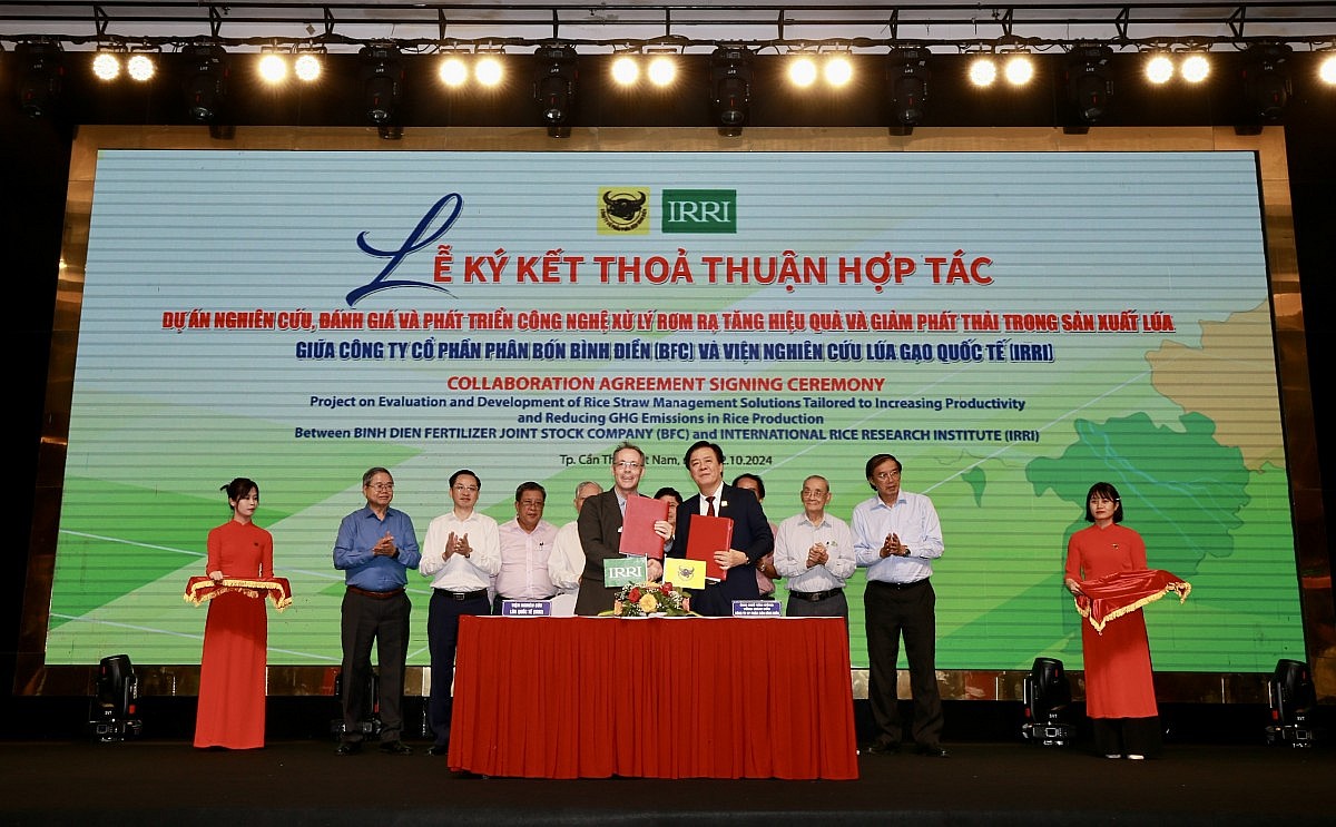 Dịp này, Viện nghiên cứu Lúa gạo Quốc tế (IRRI) đã ký kết thoả thuận hợp tác với công ty CP Phân bón Bình Điền về nghiên cứu, đánh giá và phát triển công nghệ xử lý rơm rạ trên đồng ruộng giai đoạn 2024-2027. Bên cạnh đó, Bình Điền cũng ký thoả thuận hợp tác với một số doanh nghiệp thực hiện chương trình “Canh tác lúa thông minh giảm phát thải vùng ĐBSCL giai đoạn 2024-2027”.