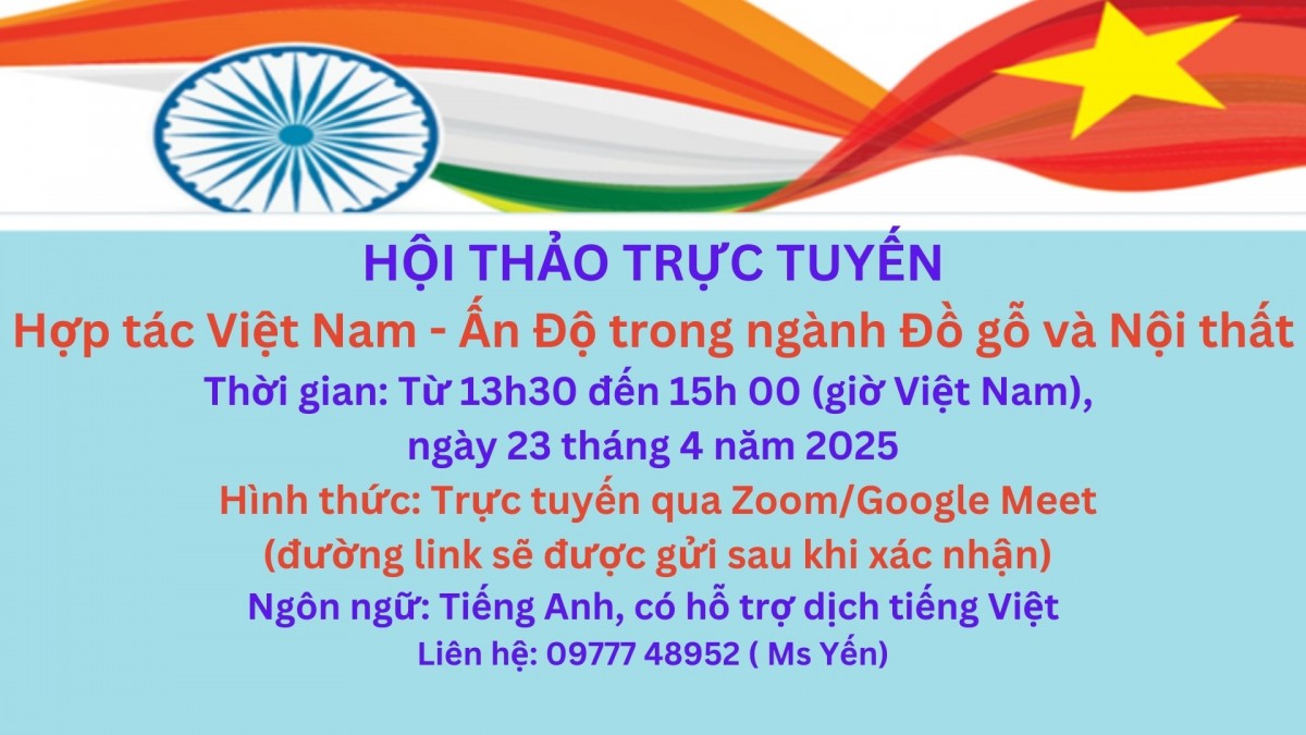 Nhằm tăng cường kết nối, thúc đẩy hợp tác thương mại và đầu tư giữa doanh nghiệp Việt Nam và Ấn Độ trong lĩnh vực đồ gỗ và nội thất, Thương vụ Việt Nam tại Ấn Độ phối hợp với các đơn vị liên quan tổ chức hội thảo trực tuyến (webinar) với chủ đề: “Hợp tác Việt Nam - Ấn Độ trong ngành đồ gỗ và nội thất”.