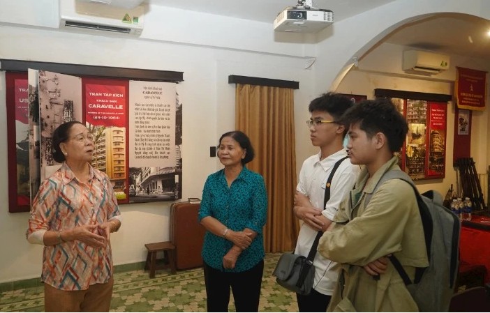 | Bà Vũ Minh Nghĩa (Chín Nghĩa) và bà Nguyễn Thị Bích Nga (phải) kể chuyện về ngày giải phóng với bạn trẻ đến tham quan Bảo tàng Biệt động Sài Gòn - Gia Định (Ảnh nhân vật cung cấp) |