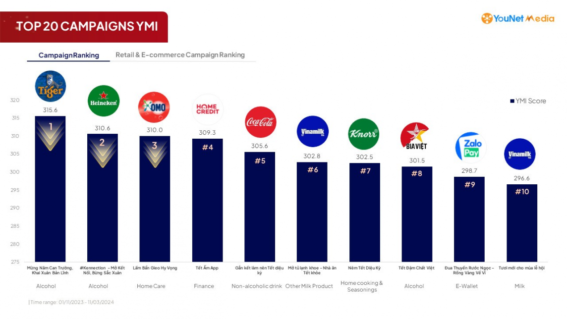Theo đó, chiến dịch “Tết ấm app” xuất sắc cán đích ở vị trí thứ 4 bảng xếp hạng YMI các chiến dịch Tết 2024 nổi bật nhất trên mạng xã hội, thu hút hơn 930k thảo luận và hơn 210 ngàn người tham gia thảo luận.