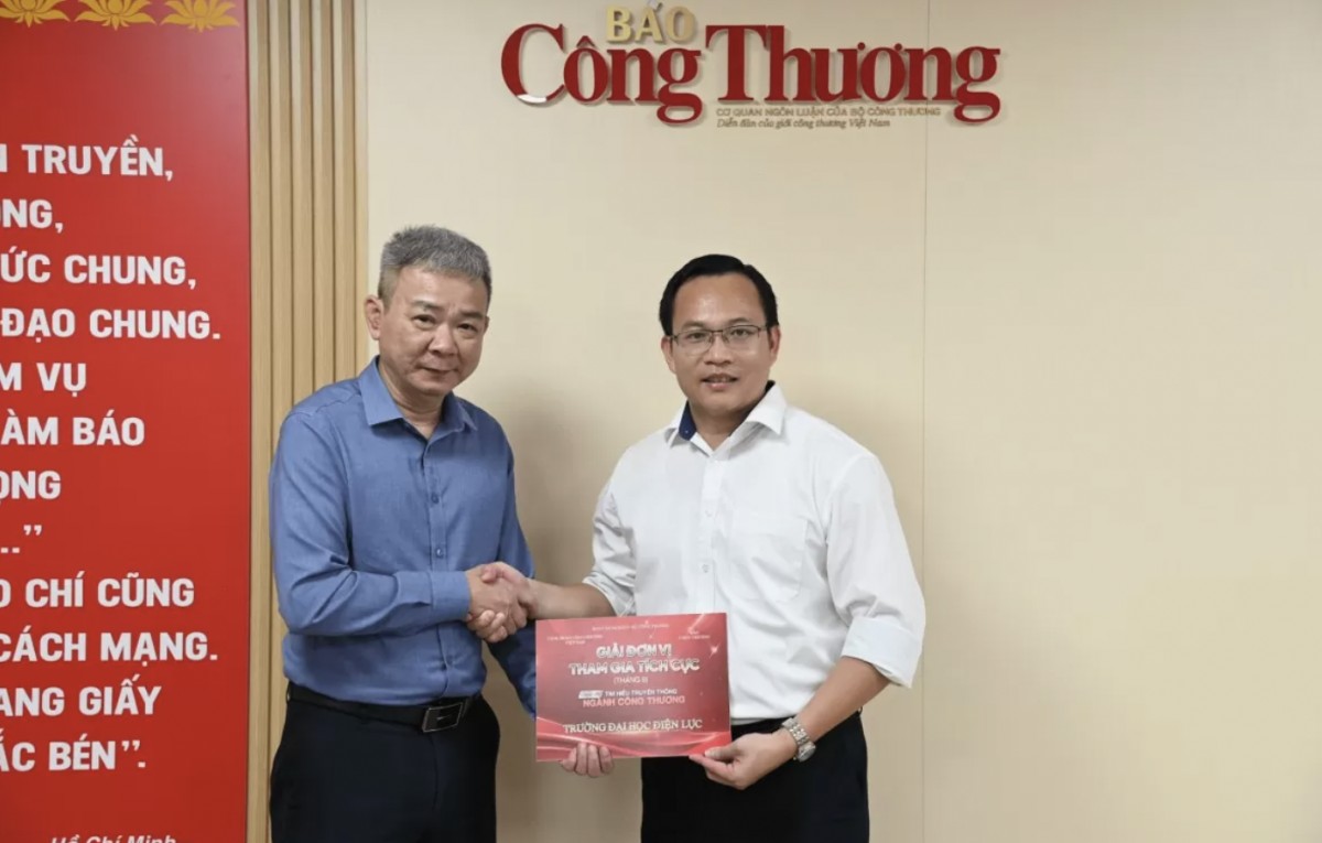 | Lãnh đạo Báo Công Thương - đại diện Ban Tổ chức trao giải cho đại diện Trường Đại học Điện Lực nhận giải Đơn vị tham gia tích cực đợt 1 tháng 9 |