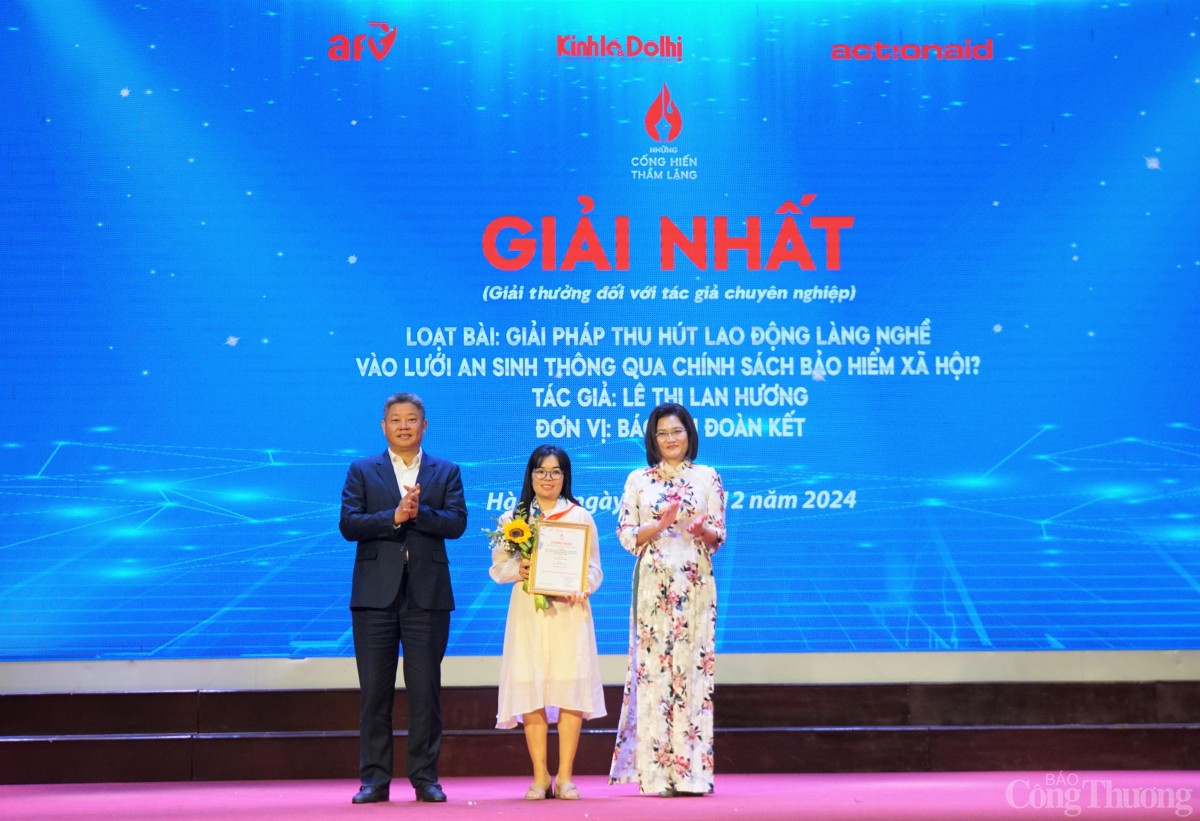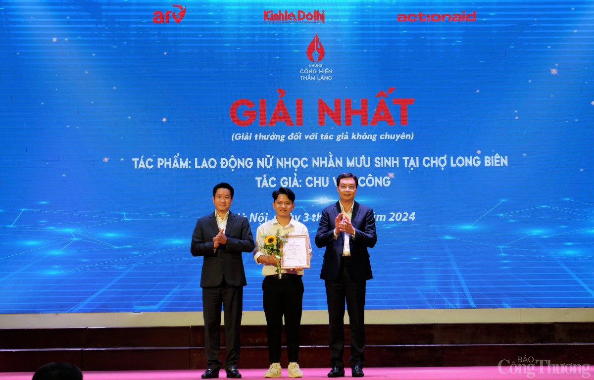 | Ban Tổ chức Cuộc thi "Những cống hiến thầm lặng" trao giải Nhất cho tác giả đoạt giải khối chuyên nghiệp. Ảnh Lê Châu |