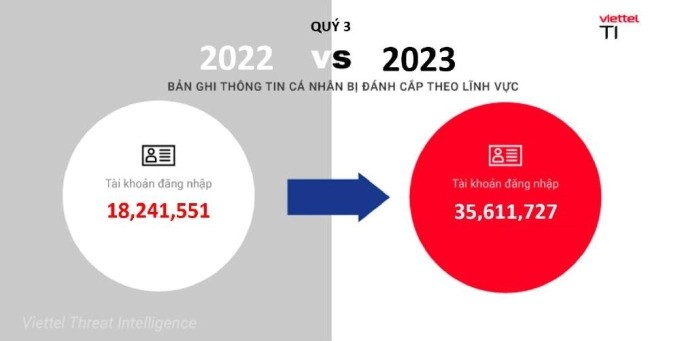 Theo thống kê từ Báo cáo Viettel Threat Intelligence của Công ty An ninh mạng Viettel, trong năm 2023 Việt Nam có 12 triệu tài khoản bị xâm nhập và 48 triệu bản ghi dữ liệu cá nhân, tổ chức bị rò rỉ và được rao bán trên không gian mạng. Cụ thể, có hơn 11.000 tài khoản giáo dục và hơn 30.000 tài khoản ngân hàng bị xâm nhập, gây thiệt hại hơn 16 tỷ đồng. Cùng với đó, 10.552 tài khoản của các đơn vị bán lẻ, 26.654 tài khoản các đơn vị sản xuất bị xâm nhập và đánh cắp… Con số này tăng 200% so với năm ngoái.