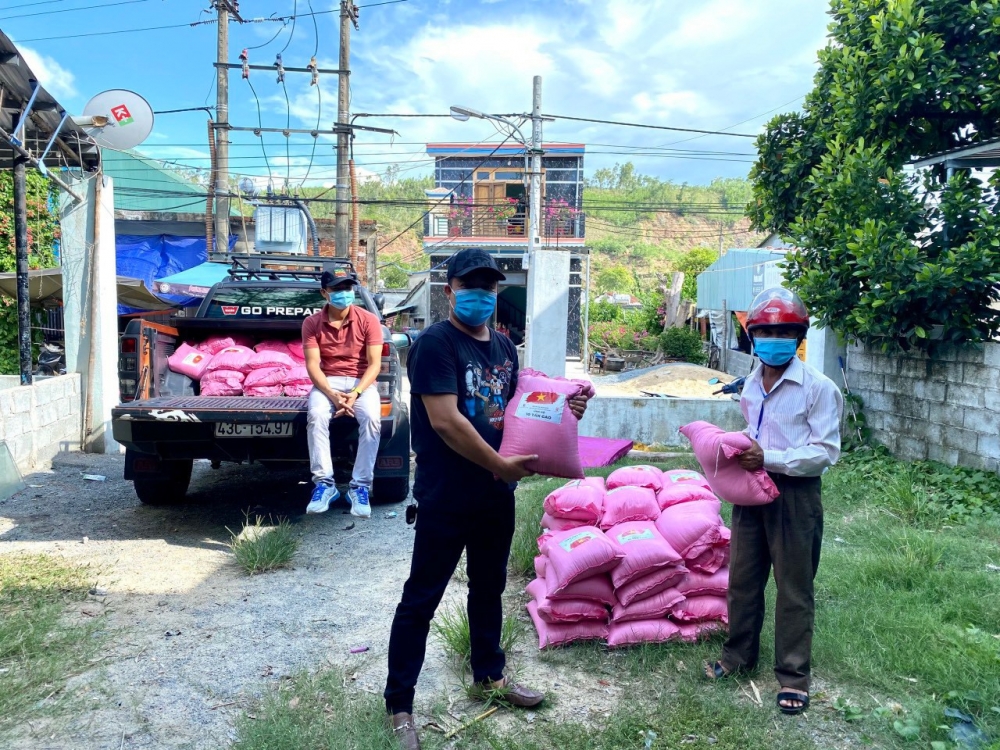 Anh Trần Hoàng Vương- Chủ nhiệm CLB Thuận Phước Garden cùng các thành viên mang gạo đến trao tại khu dân cư khó khăn |