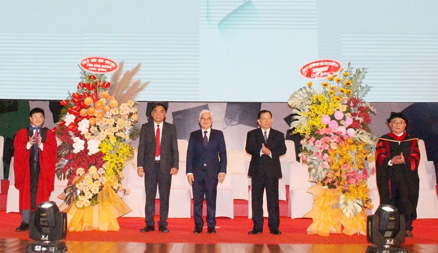 Ông Nguyễn Văn Lợi - Bí thư Tỉnh ủy tỉnh Bình Dương (giữa), ông Nguyễn Lộc Hà - Phó Chủ tịch UBND tỉnh (thứ 2 bên trái qua) và đại diện Tổng Công ty Becamex IDC tặng hoa chúc mừng cho Ban giám hiệu Trường Đại học Quốc tế Miền Đông |