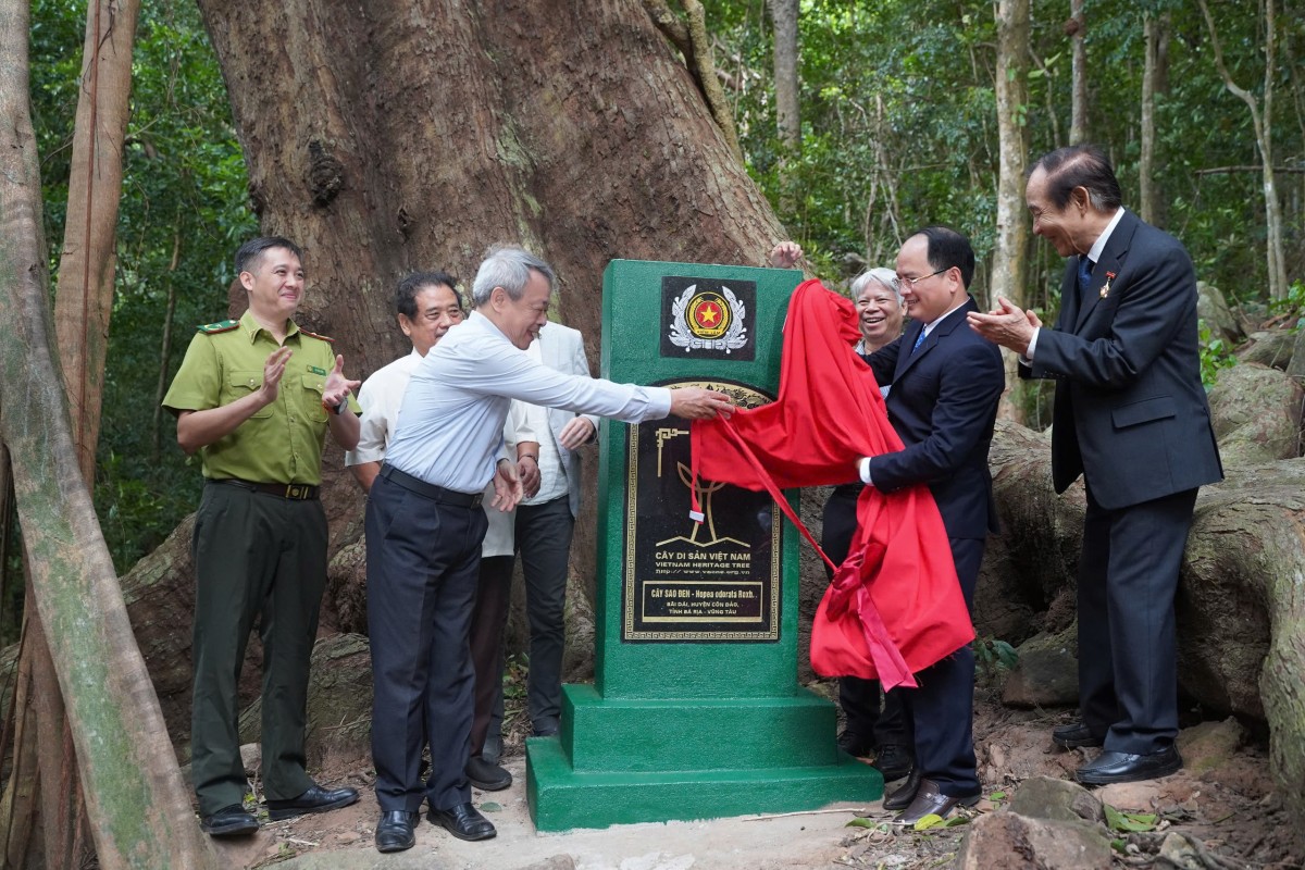 | Cây Sao đen 237 tuổi được gắn biển công nhận cây di sản. Ảnh: Vườn quốc gia Côn Đảo |
