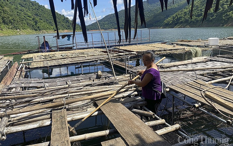 Việc phát triển nuôi cá lồng trên lòng hồ thủy điện đã giải quyết việc làm cho một bộ phận lao động, tạo sinh kế, góp phần nâng thu nhập cho bà con miền núi, nhiều hộ dân trên địa bàn nhờ nuôi cá đã thoát nghèo bền vững. Ảnh: Khu vực nuôi cá lồng trên lòng hồ ở đập thuỷ điện Bản Vẽ, huyện Tương Dương. |