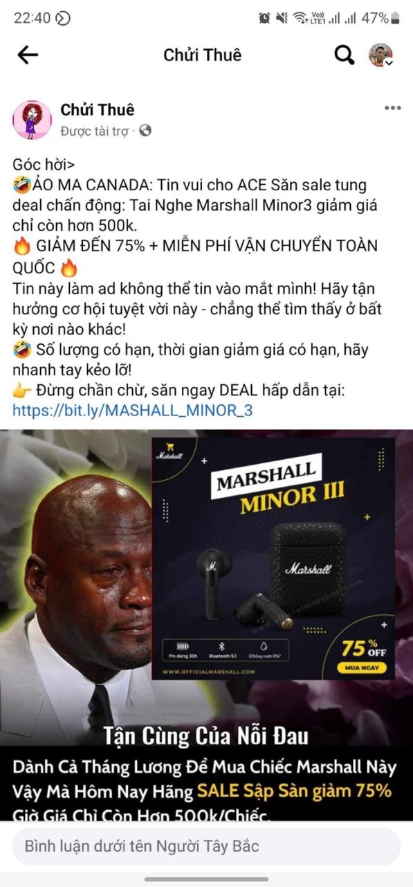 Thông tin phản ánh tới Báo Công Thương: Trang fanpage trên mạng xã hội facebook có tên Chửi Thuê, đăng tải nội dung kèm hình ảnh quảng cáo khuyến mại về sản phẩm tai nghe Marshall Minor 3, với giá chỉ còn 500 nghìn đồng. Đáng chú ý, fanpage Chửi Thuê còn quảng cáo khuyến mại sản phẩm này "giảm đến 75% với số lượng có hạn và chẳng thể tìm thấy ở bất kỳ nơi nào khác". Điều này khiến người tiêu dùng nghi ngại và cho rằng fanpage Chửi Thuê đang giới thiệu, đăng tải hình ảnh sản phẩm, khuyến mại có dấu hiệu là hàng không rõ nguồn gốc khi không nêu rõ đơn vị nào chịu trách nhiệm nhập khẩu, phân phối, không có nhãn tem phụ hàng hóa trong khi tai nghe Marshall Minor 3 được quảng cáo đến từ thương hiệu âm thanh hàng đầu của nước Anh; Không đảm bảo các quy định về điều kiện quảng cáo theo Luật Quảng cáo và mức giảm giá khuyến mại.