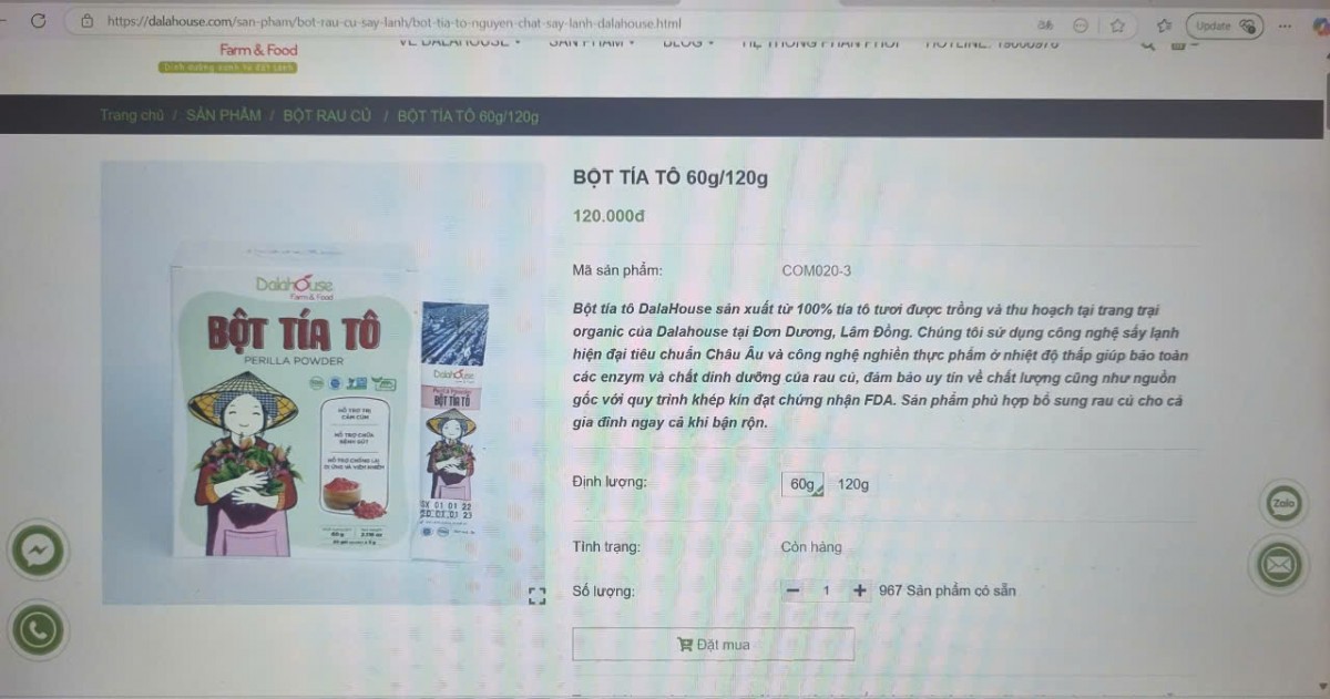 Thông tin phản ánh: Thời gian qua trên website dalahouse.com quảng cáo và rao bán hàng chục sản phẩm có nguồn gốc từ thực vật. Tuy nhiên trên bao bì của các sản phẩm này không hề thể hiện là thực phẩm thường hay thực phẩm bảo vệ sức khỏe. Các quảng cáo sử dụng nhiều từ ngữ khiến cho người tiêu dùng lầm tưởng sản phẩm như thuốc trị bệnh. Ví dụ như sản phẩm có tên gọi “bột tía tô”, trên bao bì của sản phẩm ghi công dụng hỗ trợ chữa bệnh gút, trị cảm cúm, chống lại dị ứng và viêm nhiễm…
