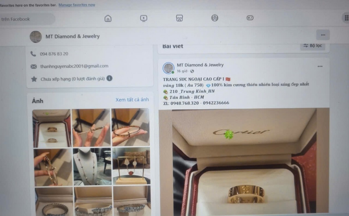 Thông tin phản ánh: Trang facebook MT Diamond & Jewelry quảng cáo và bán các sản phẩm trang sức bằng vàng giả mạo các thương hiệu Cartier, BVLGari.