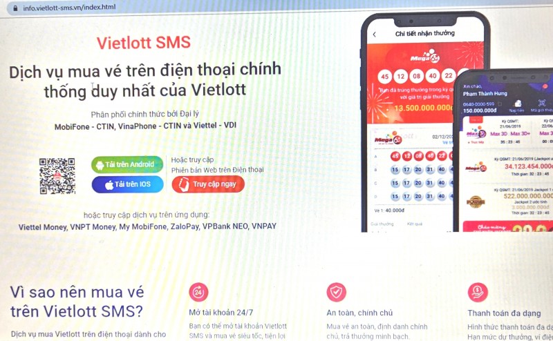 | Những lời giới thiệu về dịch vụ Vietlott SMS trên trang chủ của Vietlott |