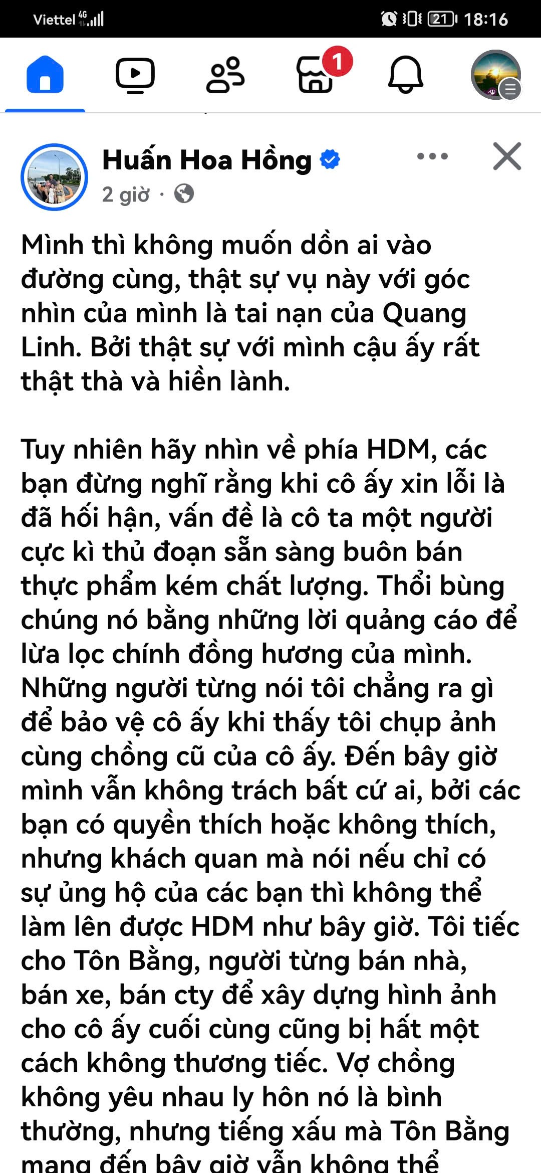 “Vấn đề là cô ta sẵn sàng buôn bán thực phẩm kém chất lượng. Thổi bùng chúng nó bằng những lời quảng cáo để lừa dối chính đồng hương của mình. Những người từng nói tôi chẳng ra gì để bảo vệ cô ấy khi thấy tôi chụp ảnh cùng chồng cũ của cô ấy. Đến bây giờ mình vẫn không trách bất cứ ai, bởi các bạn có quyền thích hoặc không thích, nhưng khách quan mà nói nếu chỉ có sự ủng hộ của các bạn thì không thể làm lên được Hằng Du Mục như bây giờ”, Huấn Hoa Hồng viết.