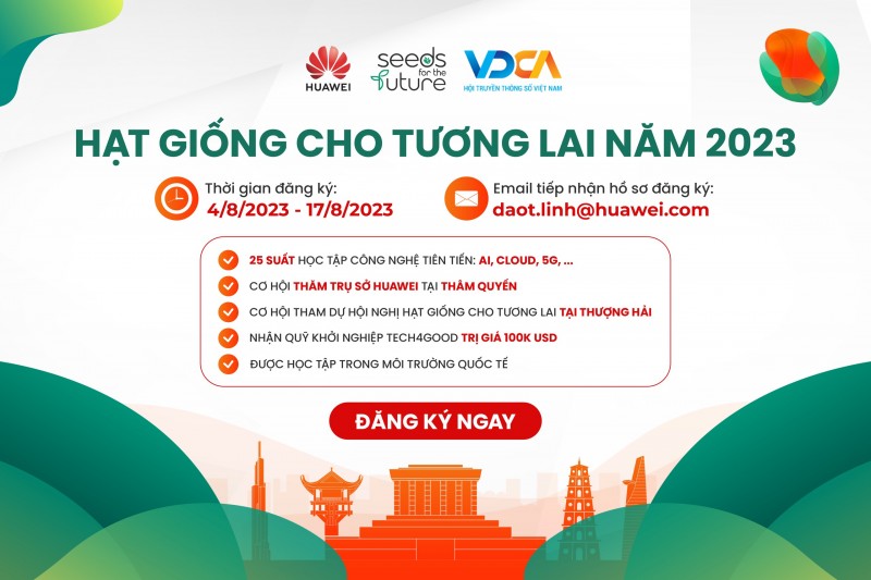 Năm 2023, lần đầu tiên Huawei Việt Nam phối hợp cùng Hội Truyền thông số Việt Nam tổ chức chương trình “Hạt giống cho Tương lai” mùa thứ 08, hứa hẹn mang lại nhiều cơ hội học tập, làm chủ công nghệ số cùng nhiều hoạt động ý nghĩa và thiết thực cho các bạn sinh viên Việt Nam. Chương trình năm nay sẽ tuyển chọn 25 sinh viên xuất sắc để cùng khám phá những tiến bộ công nghệ mới nhất của 5G, AI, Cloud, IoT,… và lắng nghe chia sẻ từ các chuyên gia quốc tế trong ngành thông qua nền tảng học tập trực tuyến Seeds Academy từ ngày 21/08 đến 28/08/2023.