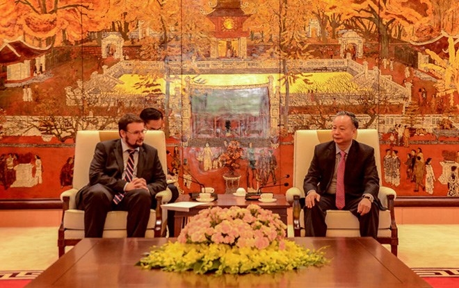 | Vice Chairman of the Hanoi People’s Committee Nguyen Van Suu (R) and Deputy Minister of State at the Hungary’s Ministry of Foreign Affairs and Trade Bezetei Akos - Photo: hanoimoi |