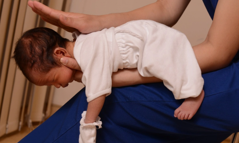 Bước 6, lật ngửa trẻ một cách cẩn thận (giữ chặt đầu và cổ), giữ trẻ nằm ngửa trên mặt trong cẳng tay tựa vào đùi. Giữ đầu thấp hơn cơ thể.