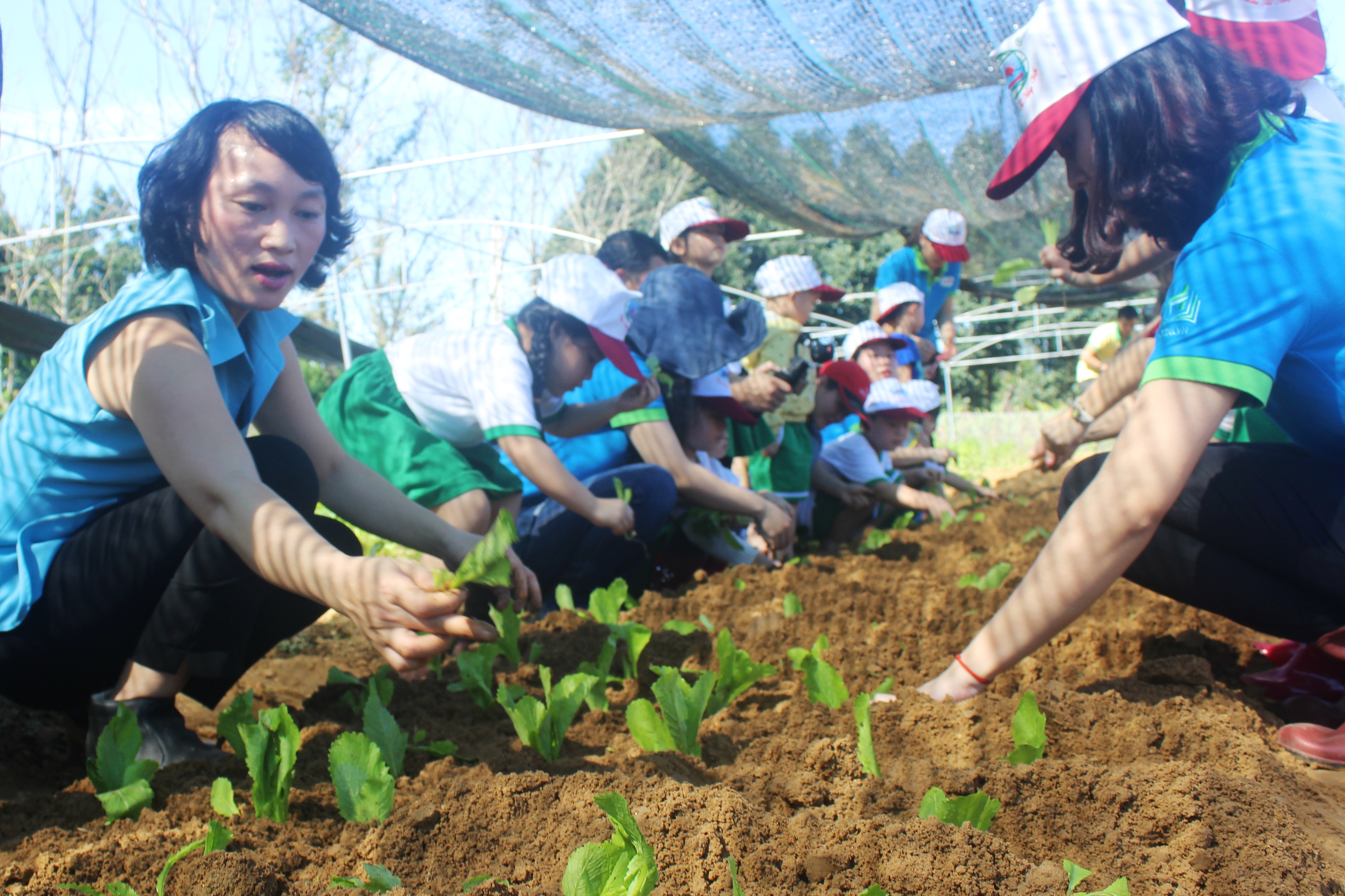 Chị Nguyễn Thị Huệ (ngoài cùng bên trái), Giám đốc Huế Việt đang hướng dẫn các cháu thiếu nhi làm nông nghiệp