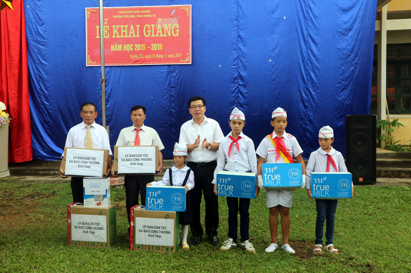 Thứ trưởng, Phó Chủ nhiệm Ủy ban Dân tộc Lê Sơn Hải tặng quà cho thầy và trò Trường Tiểu học và Trung học cơ sở Nghĩa Tá (Chợ Đồn, Bắc Cạn)