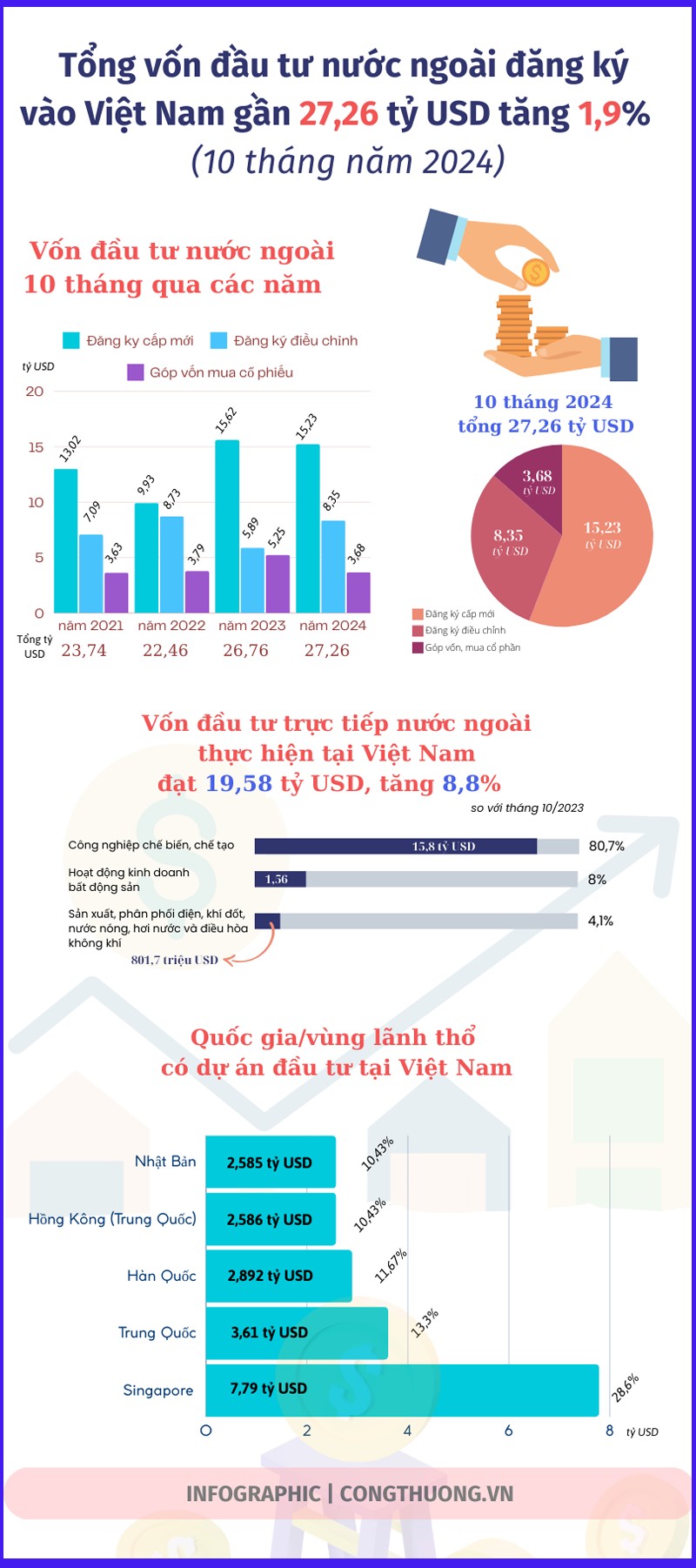 10 tháng năm 2024, tổng vốn đầu tư nước ngoài đăng ký vào Việt Nam đạt gần 27,26 tỷ USD, tăng 1,9% so cùng kỳ năm 2023, gồm vốn đăng ký cấp mới, vốn đăng ký điều chỉnh và giá trị góp vốn, mua cổ phần của nhà đầu tư nước ngoài.