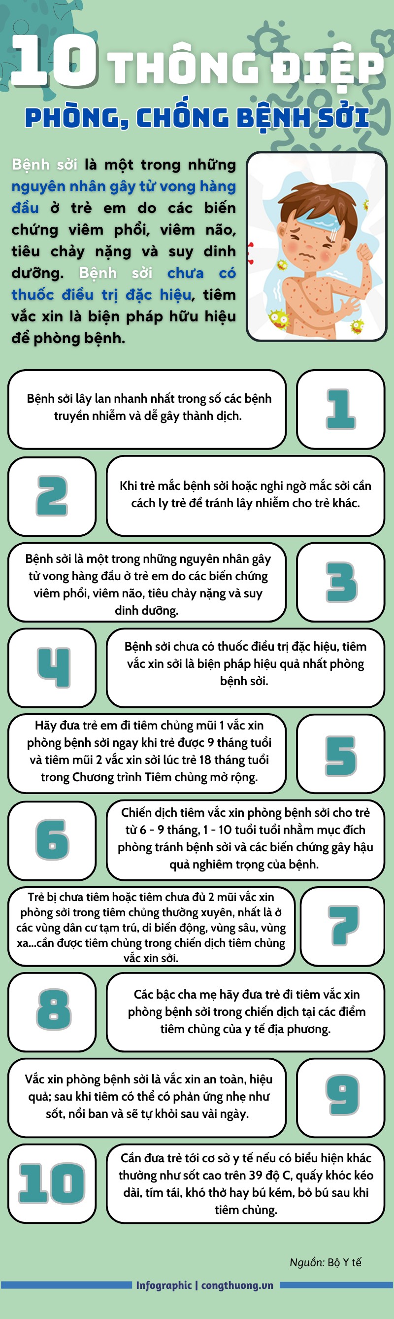 Bệnh sởi là một trong những nguyên nhân gây tử vong hàng đầu ở trẻ em do các biến chứng viêm phổi, viêm não, tiêu chảy nặng và suy dinh dưỡng. Bệnh sởi chưa có thuốc điều trị đặc hiệu, tiêm vắc xin là biện pháp hữu hiệu để phòng bệnh.