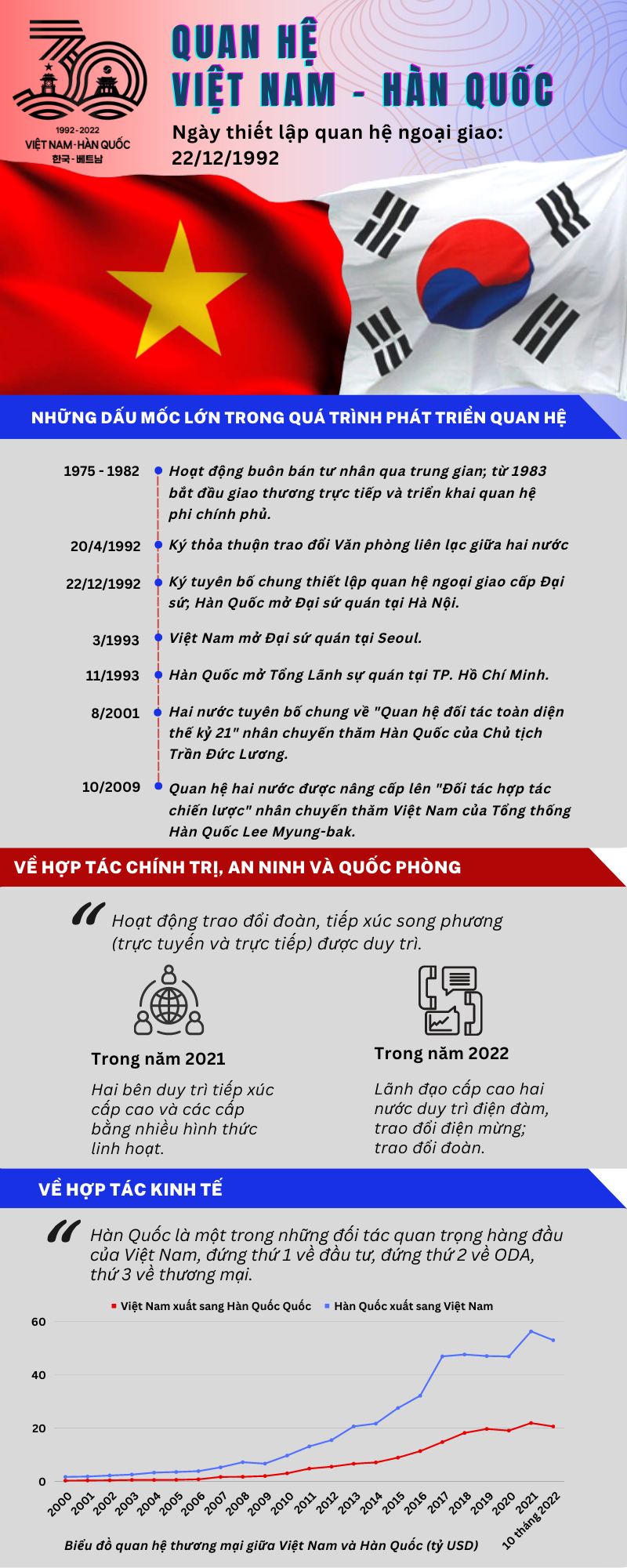 Năm 2022 không chỉ là năm kỷ niệm 30 năm thiết lập quan hệ ngoại giao mà còn là dấu mốc quan trọng, mở ra thời kỳ phát triển mới trong quan hệ Việt Nam – Hàn Quốc với nhiều thành tựu to lớn hơn.