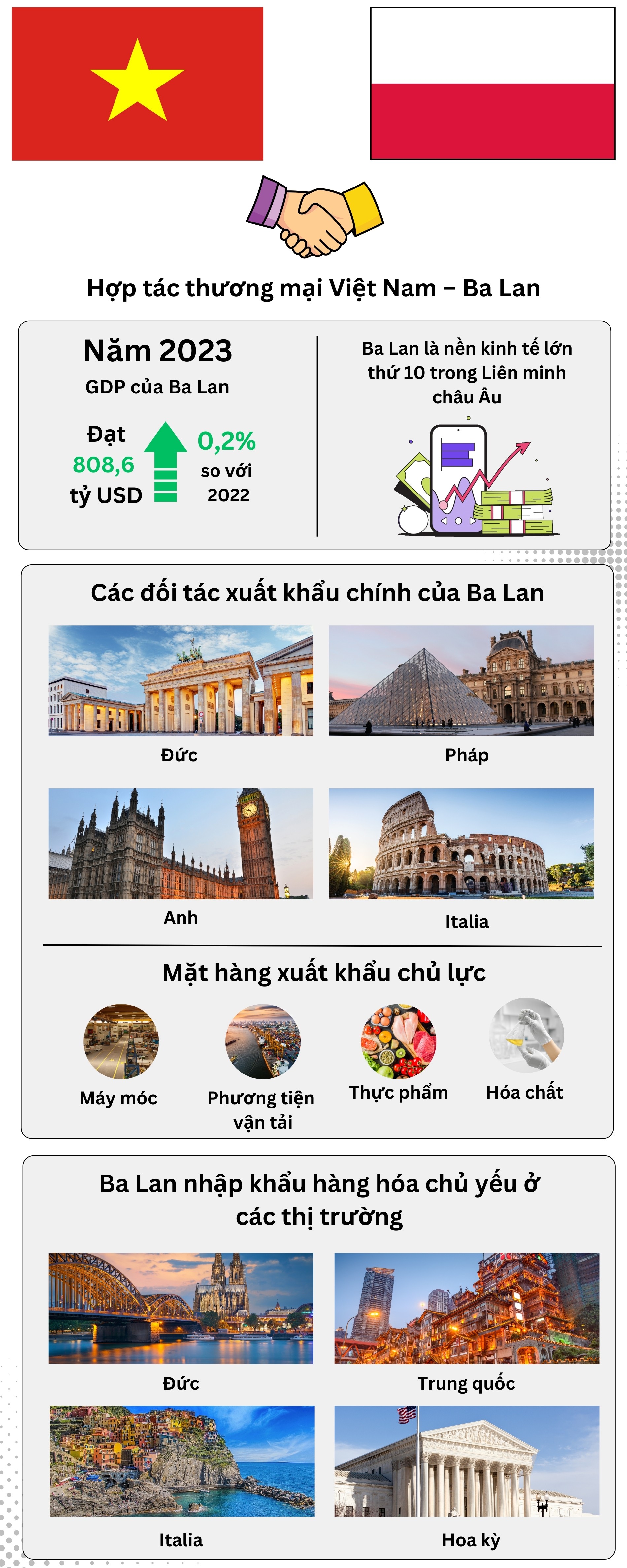 Ngày 4/2/1950, hai nước thiết lập quan hệ ngoại giao. Năm 2023, GDP của Ba Lan khoảng 808,6 tỷ USD, tăng 0,2% so với 2022. Ba Lan là nền kinh tế lớn thứ 10 trong Liên minh châu Âu.