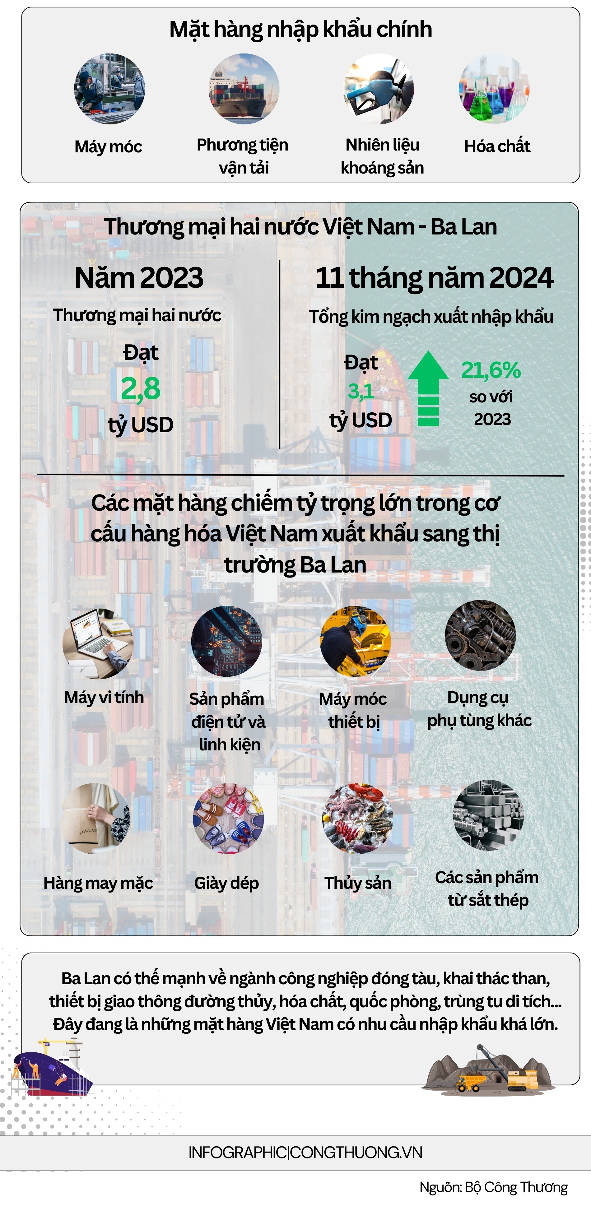 Năm 2023, thương mại hai nước đạt 2,8 tỷ USD và 11 tháng năm 2024, tổng kim ngạch xuất nhập khẩu tăng đã tăng lên mốc 3,1 tỷ USD, tăng đến 21,6% so với cùng kỳ. Các mặt hàng chiếm tỷ trọng lớn trong cơ cấu hàng hóa Việt Nam xuất khẩu sang thị trường Ba Lan gồm máy vi tính, sản phẩm điện tử và linh kiện, máy móc thiết bị, dụng cụ phụ tùng khác, hàng may mặc, giày dép, thủy sản, các sản phẩm từ sắt thép...