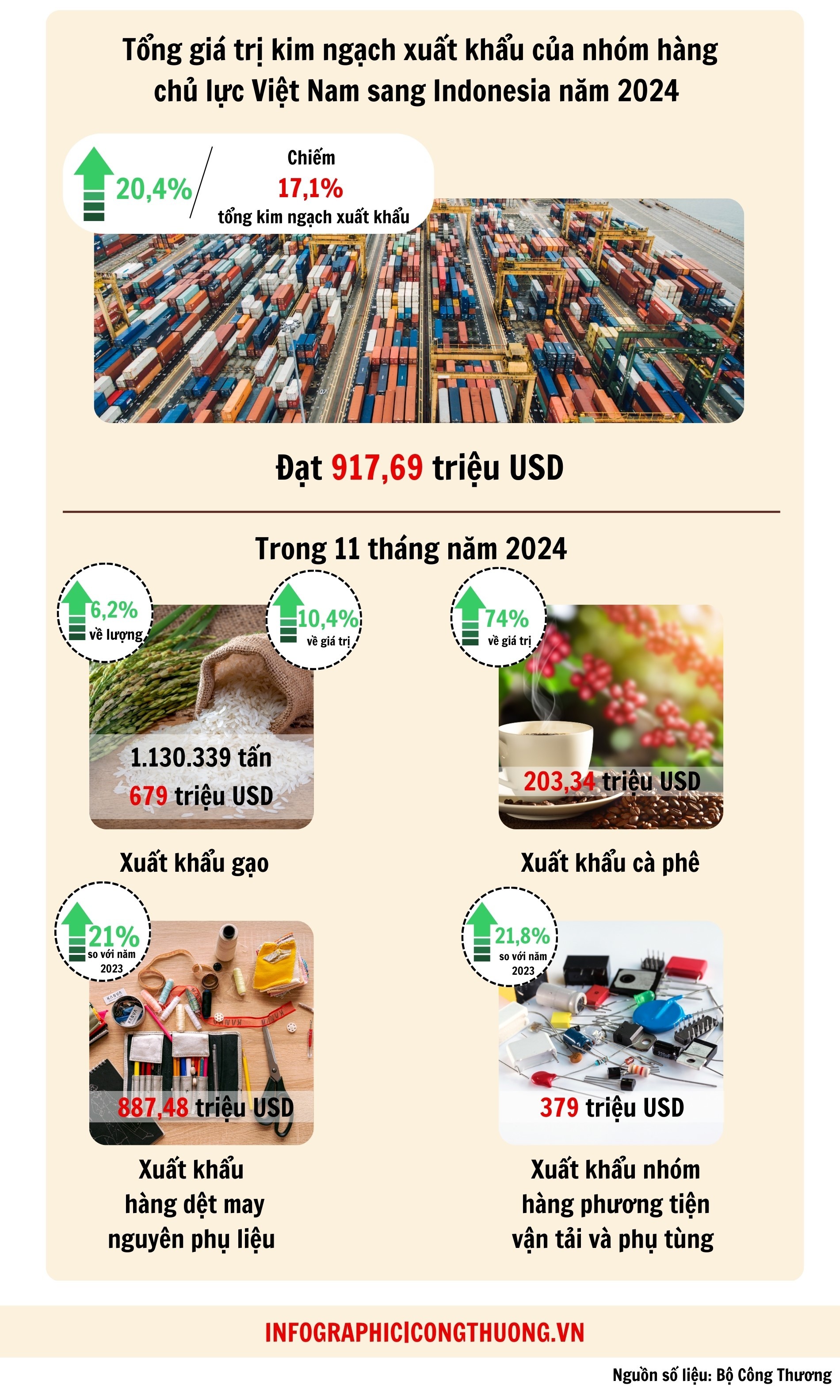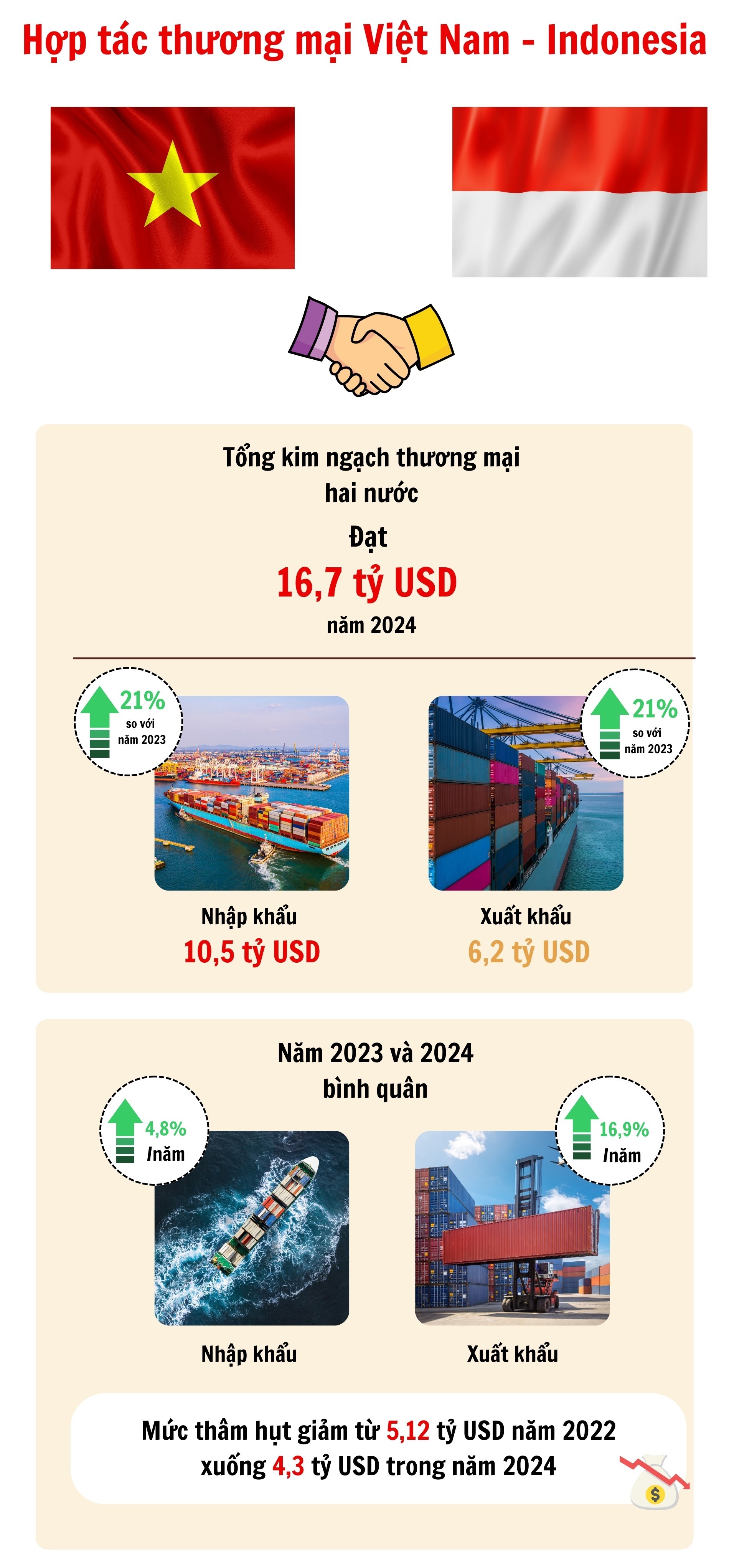 Theo Bộ Công Thương, kim ngạch thương mại song phương hai nước đạt mức cao nhất từ trước tới nay, tăng trưởng xuất khẩu của Việt Nam sang Indonesia ở mức hai con số và gần đạt mục tiêu kim ngạch song phương 18 tỷ USD vào năm 2028.
