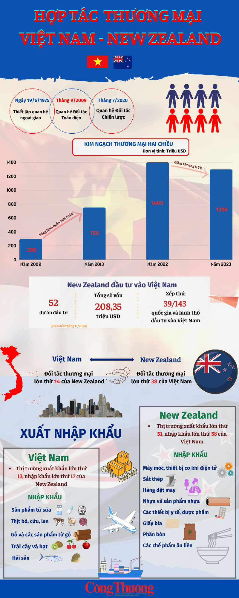 Từ khi Việt Nam - New Zealand thiết lập quan hệ ngoại giao và đặc biệt kể từ khi hai nước chính thức nâng cấp quan hệ song phương lên Đối tác Chiến lược, hợp tác kinh tế - thương mại giữa hai nước không ngừng phát triển.