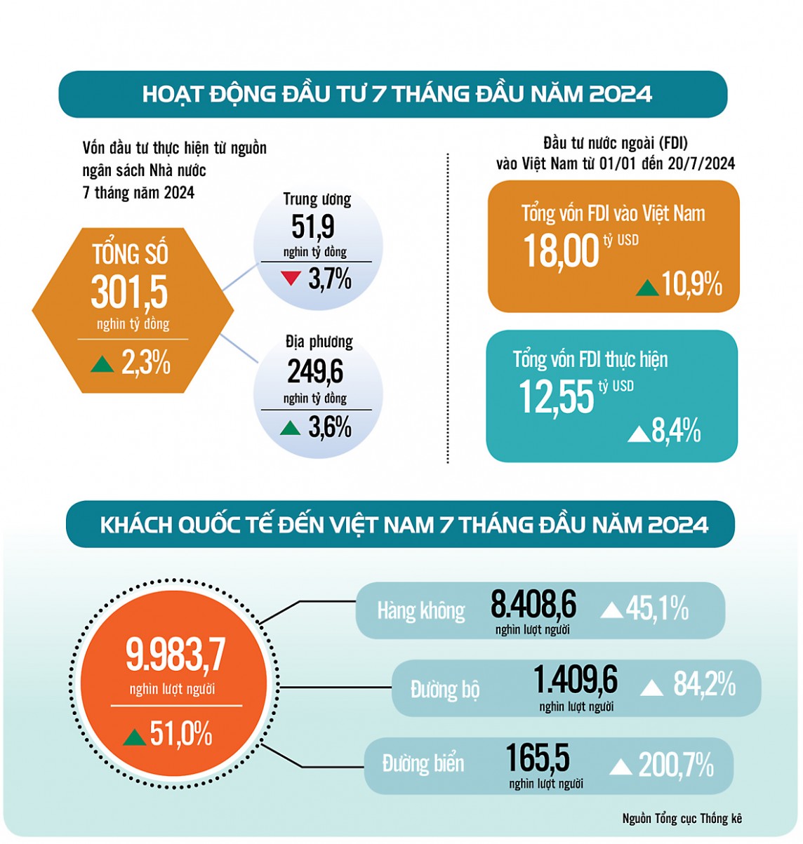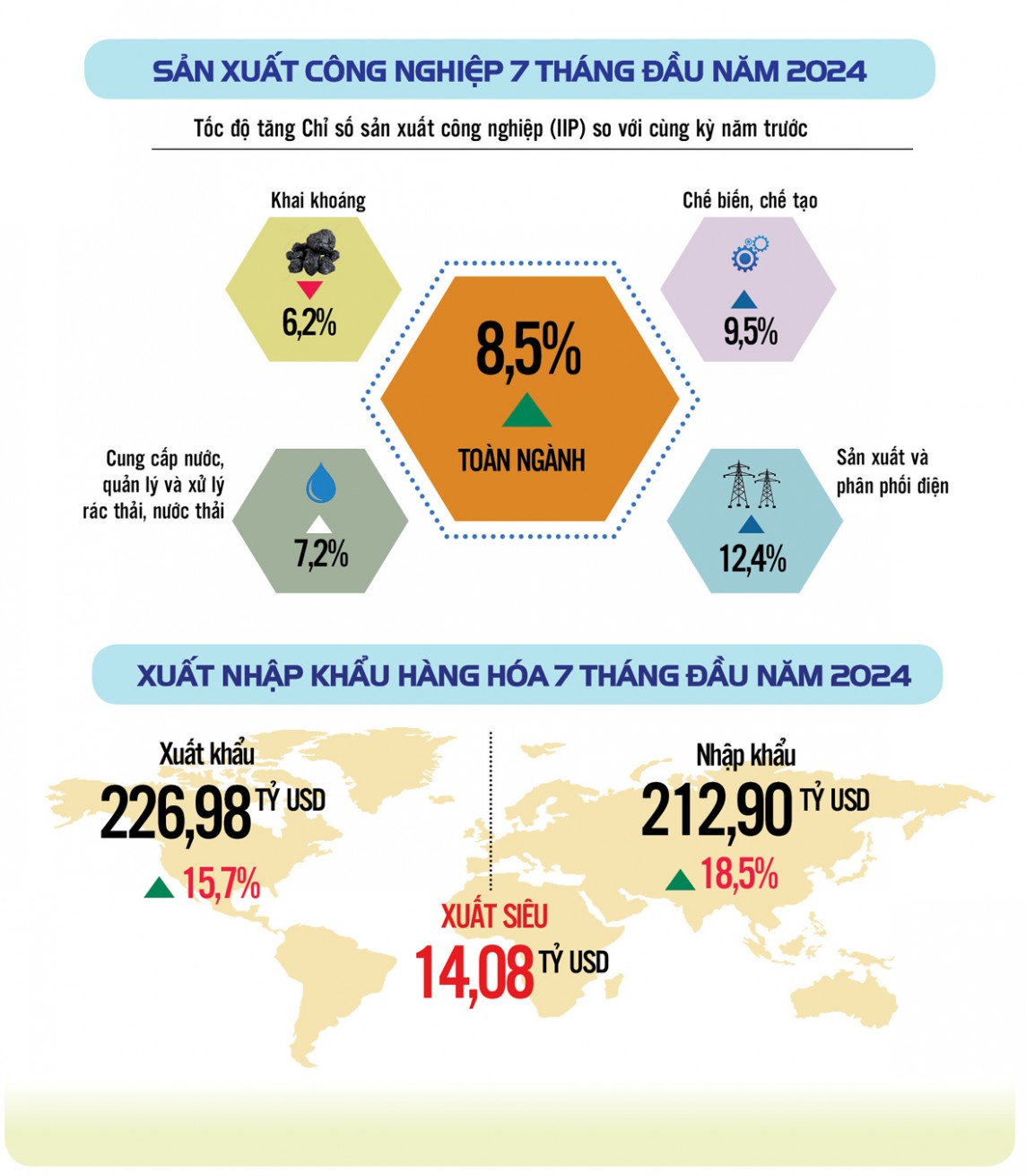 Đi qua nửa đầu năm 2024, kinh tế Việt Nam liên tục được các tổ chức quốc tế đánh giá tích cực và đặt kỳ vọng cao về khả năng tăng trưởng đạt, vượt mục tiêu. Đặc biệt, nhờ nghiêm túc, quyết liệt thực hiện hiệu quả các Nghị quyết của Chính phủ, tình hình kinh tế - xã hội tháng Bảy và 7 tháng năm 2024 của nước ta duy trì xu hướng tích cực, các ngành, lĩnh vực đạt được nhiều kết quả quan trọng, tạo đà tăng trưởng cho các tháng, quý tiếp theo.